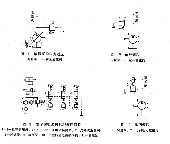 ①工作压力p 液压泵实际工作时的输出压力称为工作压力。液压泵在运行过程中,其工作压力的大小或者随负载变化而变化(压力适应)(图F),即负载越大,泵的工作压力越大,反之则泵的工作压力越小;或者由压力控制阀或恒压泵稳定在一个或几个设定值上(单级调压或多级调压)(图G和图H);对于比例控制压力系统,泵的压力将随比例压力控制阀的输入信号(电流)的变化而变化(图I)。